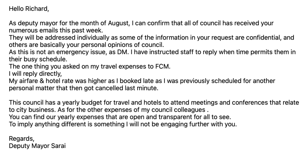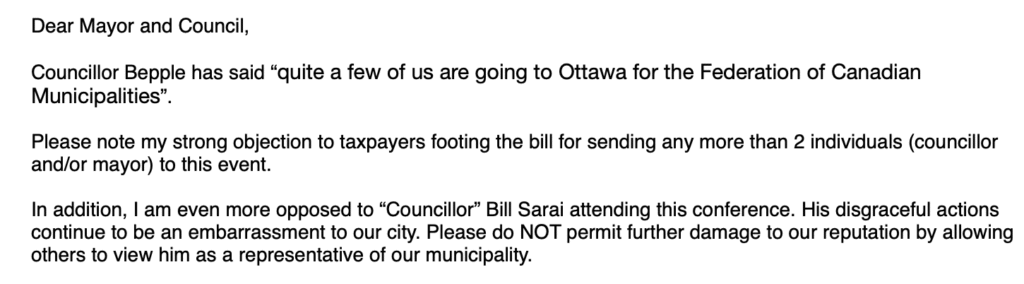 Despite emailing citycouncil@kamloops.ca objecting to any more than 2 council members attending the event, 5 councillors attended. This included Councillor Bill Sarai, whose attendance I clearly noted my opposition to.